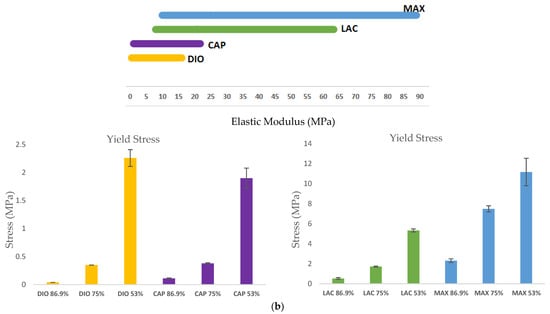 The mechanical behavior of 3D scaffolds under compression was characterized and is shown in Figure 4. All of the materials exhibit a toe region followed by linear and subsequent plastic deformation (Figure 4a). It is observed that mechanical strength of 3D printed structures is dependent on the inherent properties of the material, as well as pore size. When comparing the four materials, DIO with a pore size of mm is the softest exhibiting a compressive modulus of 0.3 MPa which is 3.1, 25.8, and 32.6-fold less than CAP, LAC, and MAX, respectively. An increase in porosity leads to a significant increase in compressive modulus and yield strength, with DIO exhibiting the greatest change with respect to pore size as an increase in porosity from 53.2% to 86.9% produces a 53-fold increase in elastic modulus while similar porosities produce a 23, 8, and 9-fold increase for CAP, LAC, and MAX, respectively (Figure 4b). The inherent properties of the material and regulating pore size through precise 3D printing make it possible to achieve the desired mechanical properties.