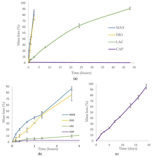 Accelerated degradation; (a,b) Degradation of MAX, DIO, LAC, and PCL in 1 M NaOH. (c) Degradation of CAP in 5 M NaOH. Data is represented as mean .