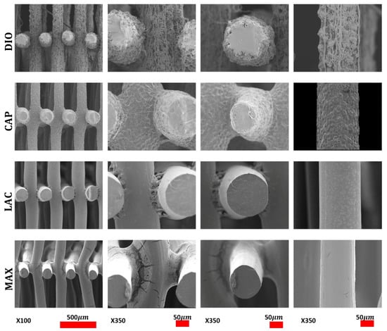 Accelerated degradation in alkaline medium was conducted to investigate hydrolytic degradation of all the monofilaments. Hydrolysis is a chemical reaction of water molecules with polymers that produces carboxylic acid, followed by cleavage of -OH bonds, resulting in the erosion of polymer matrix [16]. In this study, mass loss rate was evaluated in NaOH and depicted in Figure 5. By comparison of these results with contact angle analysis, it is realized that more hydrophilic surfaces shows higher degradation speed (Figure 3). SEM analysis shows surface erosion for four materials as the predominant degradation pathway. Figure 6 illustrates that degradation begins from the edges with no voids being seen radially towards the core. However, surface morphology of each polymer is different due to various rates of hydrolysis and water penetration into the polymer fibre with DIO exhibiting large voids on the surfaces. Hydrophilic surfaces for DIO, as well as fast hydrolysis, results in decreased stability and porosity. PCL exhibits a roughened surface due to the presence of highly water-resistant crystallites. MAX and LAC show smooth surfaces and uniform edges, with MAX exhibiting a high density of cracks at the fusion points and fibre surface leading to decreased mechanical stability and greater water accessibility.