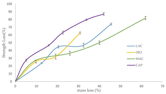 Strength loss versus mass loss for degraded scaffolds with porosity of 75%. Data is represented as mean .
