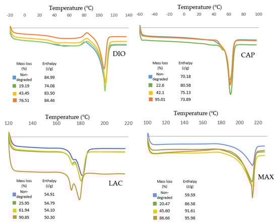 For MAX, during degradation the area of endothermic peaks increases from 59.59 to 95.98 J/g showing an increase in crystallinity. Additionally, the endothermic peak of the sample with the highest mass loss exhibits a narrowing which shows less crystallite size distribution. A small exothermic peak is observed before the melting peak that increases during degradation. This exothermic peak can be attributed to recrystallization before melting. Since higher levels of degradation produce a higher degree of ordered structures, there is greater probability of recrystallization as indicated by increasing exothermic peaks.