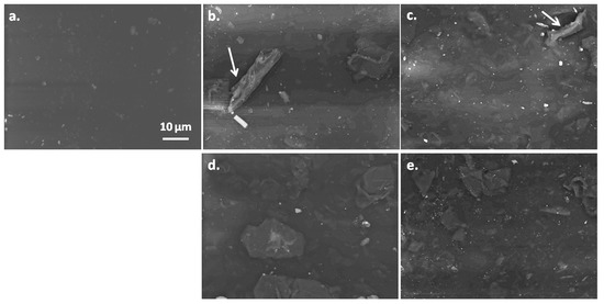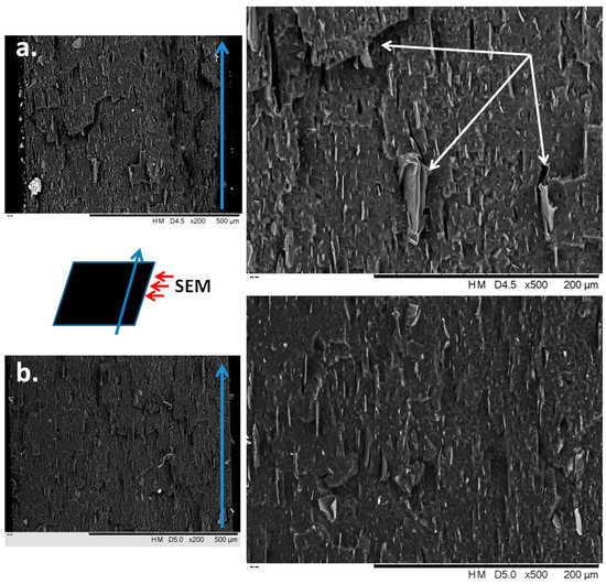 The fractured plates were visualized on the whole width (Figure 10—left images) and at higher magnification (right images). It may be observed that G particles (lighter color) are in the form of platelets of graphene layers having a thickness ranging from tens of nanometers to a couple of microns. Therefore, some exfoliation of G occurred during the melt processing step. It is remarkable that most of the graphene layers are oriented regardless of their size and treatment, thus keeping the orientation induced during the manufacture. Some voids are clearly observed in SEBS-15G composite, especially surrounding larger G particles (Figure 10a—white arrow). Graphene platelets seem well dispersed in SEBS in both composites, but smaller size platelets (shorter and thinner) were observed in SEBS-15GVS compared to the untreated composite. These observations correlate well with DMA results, which showed a 30% increase of the storage modulus in SEBS-15GVS compared to SEBS-15G.