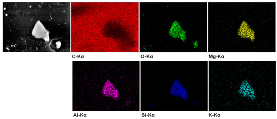 SEM micrographs on the surface of SEBS and SEBS-G composites are illustrated in Figure 1. Some light-colored, micron-size objects were observed on the surface of SEBS matrix (Figure 1a). These may come from the two-phase morphology of SEBS, containing polyethylene–butylene (EB) and polystyrene (S) blocks, or from the fillers used in the commercial SEBS matrix. EDX elemental maps of such an object on the surface of SEBS (Figure 2) clearly show that this is a filler, namely an aluminosilicate also containing Mg and K elements. Less bright particles of different sizes, ranging from less than one micron to more than 10 µm, were observed only on the surface of composites and they were assigned to G particles embedded in the block copolymer (Figure 1b–e). The dispersion of G was estimated using around five SEM images for each composite. A better dispersion was observed for the silane treated samples.