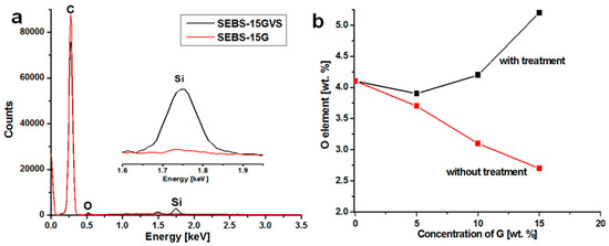 EDX spectra of SEBS-15GVS and SEBS-15G showing almost no Si on the surface of the untreated composite (a); wt % of O element on the surface of composites (b).