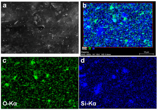 SEM image of SEBS-15GVS (a); Combined map of O and Si elements (b); O Kα and Si Kα maps of Figure 4a (c,d).