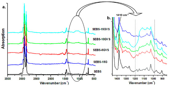 The role of the vinyl group in VS seems to be very active in the melt processing conditions. Indeed, the small peak at 1603 cm−1 was broadened to lower wavenumber in silane treated samples; this peak is characteristic to –C=C stretching [30], and it also occurs in SEBS and SEBS-G without VS due to styrene blocks, but it is modified as intensity and wavenumber in treated composites; this could mean new π–π interactions between the vinyl group in VS and the aromatic side chains of SEBS, on the one hand, and the condensed rings in the graphene layers of G, on the other hand. The processing temperature during the preparation of the samples was high (close to 160 °C), and the occurrence of free radicals cannot be avoided due to mechano-chemical processes; these free radicals may favor the grafting of VS to both phases [31]. Interestingly, a small peak was observed at about 1410 cm−1 in silane treated samples and corresponds to the vinyl group in VS [26]; the intensity of this peak was small in SEBS-5GVS and SEBS-10GVS but slightly higher in SEBS-15GVS (Figure 5b), the composite with the highest concentration of silane. This shows that when used in high amount, VS was not entirely bond to the surface of SEBS or G by its vinyl moiety.