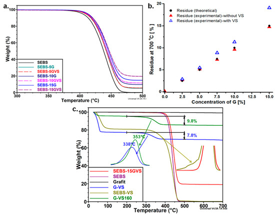 The silane may influence the thermal stability of the composites by inducing interactions between SEBS and G particles and by promoting the formation of char residue; both the physical and chemical bonds of VS to the filler or matrix will reduce the segmental mobility and decrease the diffusion rate of volatile by-products [33]. More insight into the influence of VS on the degradation of SEBS-G composites may be gained by comparing the theoretical and experimental values of the residue. The concentration of G in SEBS-G composites was considered the theoretical value of the residue (Figure 6b), because the weight loss of SEBS at 700 °C is close to 0 (Table 2), and G remains almost unaffected by temperatures up to 700 °C (Figure 6c). The experimental values of the residue for the composites without silane were close to the theoretical values, but, after the addition of VS, the residue was higher, especially for the samples with more G and, thus, contained more silane (Figure 6b); therefore, the increased residue is an effect of silane and shows the ability of VS to enhance the interaction between G and SEBS, and the amount of char.