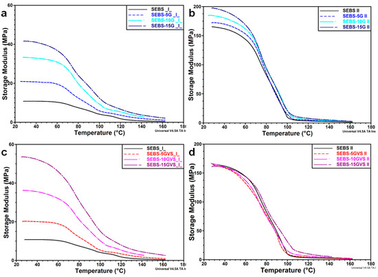 For the test in a direction parallel to that of oriented blocks in SEBS, the S and EB blocks are already stretched in the direction of the test, and higher energy is necessary to stretch the elongated EB blocks and the rigid and oriented S blocks; this has, as result, a very large E’ value, 15 times higher than that in the perpendicular direction. The addition of G restricts the mobility of the molecular chains, thus increasing the storage modulus, but the increase of E’ value in II compared to ⊥ direction is smaller in composites compared to pure SEBS (Table 3); this shows that higher concentration of G reduces the effect of orientation on the increase of storage modulus (Figure 7b). The use of the coupling agent (Figure 7d) will result in additional bonding between G particles and SEBS blocks, which will hinder the orientation of S blocks during the manufacturing process; therefore, the effect of a higher concentration of stiffer graphitic filler will be counterbalanced by a lower orientation, resulting in no variation of E’ value for SEBS-GVS composites in the II direction. Moreover, it may be assumed that the oligomeric silanes, emphasized by FTIR, will act as lubricants and will decrease the stiffness.