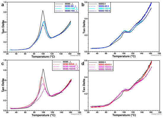 A main peak at about 100 °C was observed in the tan δ curve for the perpendicular direction regardless of G concentration and treatment (Figure 8a,c). This is assigned to the glass transition of S blocks. The intensity of this peak was lower in the composites compared to SEBS matrix, showing an increased rigidity (Figure 8a,c). The peak value of tan δ was only slightly influenced by G concentration in untreated composites, but gradually decreased in SEBS-GVS composites, which is probably an influence of the silane treatment. Some small peaks were observed before and after this main peak only in composites and were more obvious after VS treatment. They can be related to the S blocks differently bonded to G. For example, better interactions are expected in VS treated samples, and G particles may differently interact with S blocks depending on their nano- or microsize [3]. For the test in the parallel direction, the variation of tan δ values with the amount of G falls within experimental error for all the composites. It is worth mentioning that the intensity of the main peak is very small for both untreated and treated composites in the parallel test, and this shows constraints and high rigidity. This is caused by the induced orientation of S and EB blocks in the same direction as that of the test, determining high values of the storage modulus and, for similar loss modulus values, very low tan δ values.