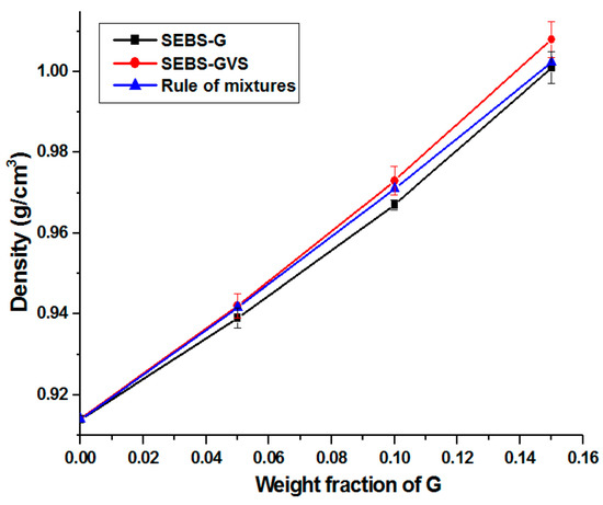 In several studies, density was found as a strong determinant for the mechanical properties of polymer composites [36,37]. The measured values of density for SEBS-G and SEBS-GVS series are shown in Figure 9. Density of composites was calculated using the rule of mixtures [36], considering the density of G, 2.23 g/cm3 [38] and the density of SEBS, 0.914 g/cm3 (experimentally determined).