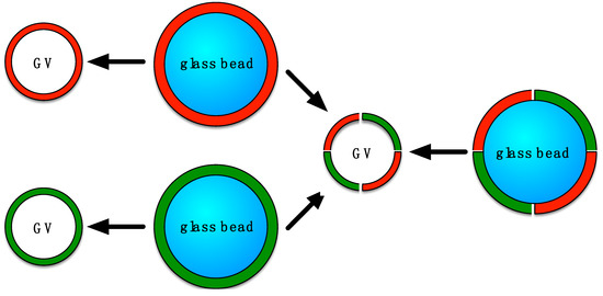 Schematic view of the formation of giant vesicles (GVs) by hydration of a glass-supported thin film of phospholipids while shaking. The glass beads are covered with thin multilayers of lipids, depicted in red and green. Two films containing two different types of phospholipids (either on the same bead or on different beads) can be combined into a hybrid vesicle.
