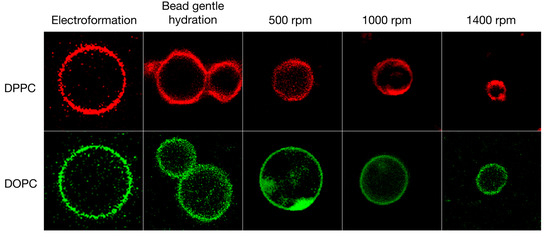 Giant vesicles formed from three different techniques: electroformation, gentle hydration of a thin film of lipids on glass beads, and the new method where the glass beads were vortex shaken during lipid film hydration at 65 °C for 1 h at different speeds. The vesicles were formulated from ultra-pure water. Each square is sized to 20 µm × 20 µm. The colors have been artificially adapted to red and green for bilayer gel and liquid crystalline phases, respectively.
