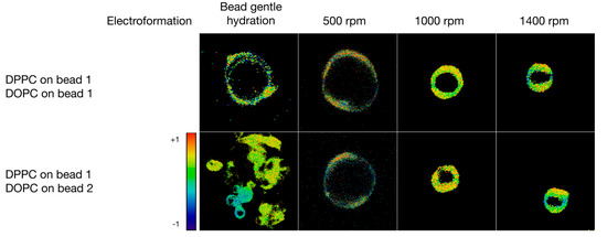 Unlike the other methods, where a lipid film of specific composition has to be prepared for each type of vesicles, our new approach opens the way for rapid formulation of various hybrid GVs. For this, we took equal weights of glass beads that were each coated with DPPC or DOPC and combined them in an Eppendorf tube. Bead gentle hydration of this mixture lead to the formulation of two separate populations of DPPC or DOPC GVs, each sized, respectively, at 5.3 μm ± 2.8 μm. In contrast to that, when the shaking step was added to the formulation procedure, hybrid liposomes formed at diameters between 8.3 μm ± 1.4 μm for 500 rpm and 4.6 μm ± 1.0 μm at 1400 rpm. This makes it possible to formulate GVs of various compositions starting from only a few batches of lipid-coated beads. Thus, glass beads coated with different thin lipid films can be combined to form hybrid GVs.