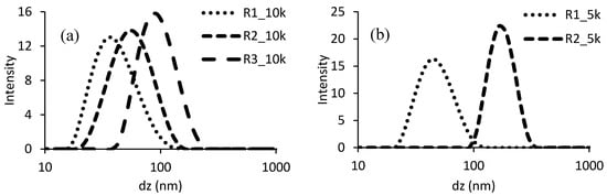 Particle size distributions of neutralized ASRs, Mw equal to 10,000 Da (a) or 5000 Da (b).