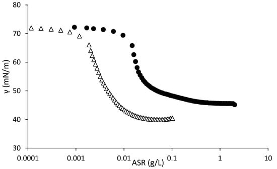 Surface tension measurements were performed at 23 °C and 55% relative humidity using a platinum Du Nouy ring installed on a KSV Sigma 700 tensiometer. The aqueous solutions of ASRs at pH 10 were added through a controlled pump Dosimat 665 onto the water at pH equal to 10 (corrected with ammonia).