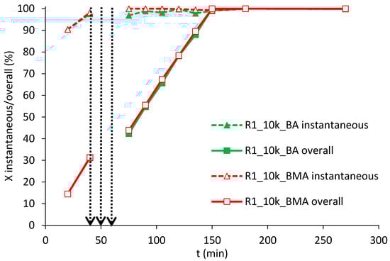 Instantaneous (dashed lines) and overall (continuous lines) conversions using BA (solid markers) or BMA (empty markers), resin R1 of Mw equal to 10,000 Da. The first vertical dashed arrow indicates the end of the first-stage feeding, the second the neutralization step and the third the start of the second-stage feeding.