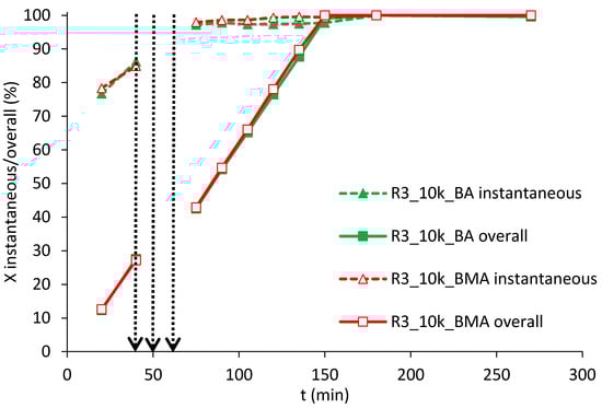 Instantaneous (dashed lines) and overall (continuous lines) conversions using BA (solid markers) or BMA (empty markers), resin R3 of Mw equal to 10,000 Da. The first vertical dashed arrow indicates the end of the first-stage feeding, the second the neutralization step and the third the start of the second-stage feeding.