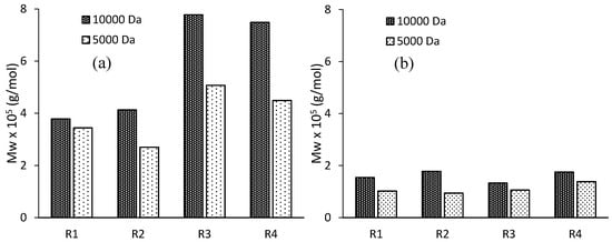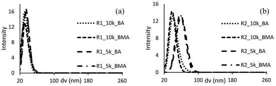 In terms of nucleation, samples of latexes using R1 of molecular weight equal to 10,000 Da were characterized by multimodal distributions by DLS measurements early during the feeding of BA or BMA; it is very likely some large particles are formed in the system as a consequence of coagulative events. Similar observations have been made with R2, with highest molecular weight. These systems start from resins of small size and a lot of surface has to be stabilized, since the number of particles is relevant (around 1 × 1018 particles at the beginning of the feeding period). The rest of the latexes, however, presented monomodal distribution and the particle size distributions of the final latexes, as measured by HDC, are presented in Figure 5. In those figures also appear the PSD of the latex from R1 and R2 with Mw 10,000 after filtration through a 1.2 μm filter.