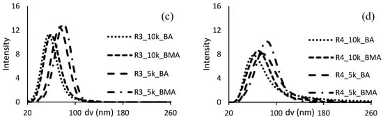 The sizes of aggregates in solution after neutralization (or particles in the case of turbid systems) have also been measured through dynamic light scattering, to understand the colloidal characteristics of the ASRs that will be used as protective colloids to polymerize BA or BMA. Figure 1 presents the particle size distribution of the different resins, comparing ASRs of the same size, since the Mw of the colloid is a crucial point to determine the dissolution behavior when neutralized [29]. The resins R3, size 5000 Da, and both R4 were not sufficiently stable during storage and the data are not available. This last feature is another indication of the inhomogeneity of the mentioned ASRs, composed of hydrophobic chains together with hydrophilic soluble polymer. In addition, an appreciable amount of water soluble polymer can cause colloidal instability, a phenomenon known as “depletion flocculation” [30].