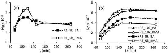 Focusing on R1 and R3, to point out eventual differences between resins formulated with acrylates or methacrylates, the numbers of particles were calculated in both situations at different time of reaction (Figure 6).