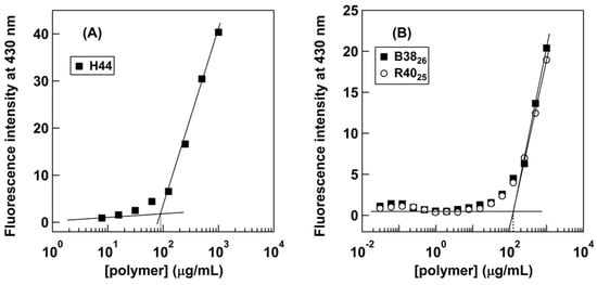 Fluorescence intensity of DPH (50 nM) versus polymer concentrations of (A) homopolymer, H44 and (B) poly(IBVE-co-AEVE)s with MPIBVE ~25 mol % in HEPES buffer (pH 7). The data points represent the average from duplicate measurements.