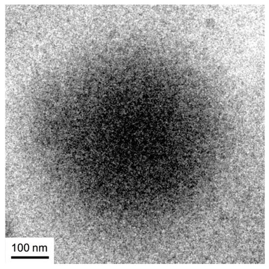 The results of the DHP uptake experiments indicated that the hydrophobicity of the PIBVE blocks of B3826 is not sufficient for the DHP uptakes. However, our previous study demonstrated that the B3826 polymer chains were able to form large aggregates with diameters of 400–500 nm. To investigate the aggregation mechanism of B3826, we examined the structure of the aggregates at 10 mg/mL, which is substantially higher than the critical concentration observed in the DPH uptake experiments using cryo-TEM (Figure 3). The aggregate particle in the cryo-TEM image presented as a spherical blur shadow with no clear boundaries. The diameter of the particle was found to be around 500 nm, which is consistent with the results of the SLS and DLS measurements (Table 1). In our previous study, the SLS data suggested that the density of the polymer chains in the B3826 aggregates was relatively low, and the aggregates were relatively large, such that we speculated that B3826 formed a vesicle (polymer bilayers). However, the aggregate structure presented in the cryo-TEM image does not appear to have any polymer bilayers, but seems rather to consist of low-density polymer aggregates without any defined structures.