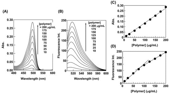 First, we investigated the concentration dependence of fluorescence emission from F-B3826. A small amount of F-B3826 was added to non-labeled B3826 with in HEPES buffer. Based on the absorbance of 20 µg/mL polymer solution and free fluorescein absorbance, the FITC content in this mixture was estimated to be 5.3 mol % or 5.3 FITC in 100 polymer chains. The fluorescence intensity increased proportionally as a function of polymer concentration, and it exhibited a flexion point at 83 µg/mL, which may indicate that the surrounding environment of FITC in polymer chains might be changed, whereas the maximum absorbance was almost insensitive to changes in polymer concentration (Figure 4). This might reflect the onset of the formation of polymer aggregates, which change the polymer conformation and density as compared to the polymer chains free in solution.