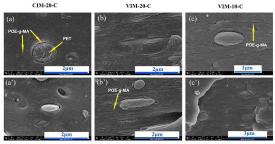 - Yin, B.; Li, L.P.; Zhou, Y.; Gong, L.; Yang, M.B.; Xie, B.H. Largely improved impact toughness of PA6/EPDM-g-MA/HDPE ternary blends: The role of core–shell particles formed in melt processing on preventing micro-crack propagation. Polymer 2013, 54, 1938–1947. [Google Scholar] [CrossRef]
