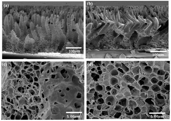 SEM cross-section of the PVDF membrane as prepared samples (a,c) as well as after the samples were immersed in hot water (b,d).