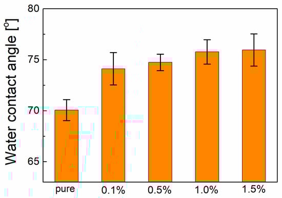 The hydrophobic membrane is suitable for the TOEC process. Thus, the surface hydrophobicity of the membrane was evaluated by the water contact angle measurement. These results are shown in Figure 3. It was clearly found that the contact angle increased with the addition of the graphene. This should be due to the significant hydrophobicity of the graphene. Introducing the graphene in the PVDF endows a more hydrophobic surface than the pure PVDF membrane. The similar results have been observed in polymer/graphene composites [6]. Therefore, the incorporation of graphene in PVDF can improve the surface hydrophobicity, which is helpful for the TOEC process.