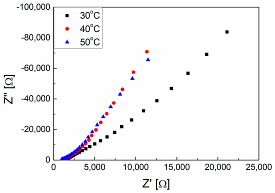 The Nyquist plots of 0.1 mol/L KCl solution at 30, 40, and 50 °C, respectively.