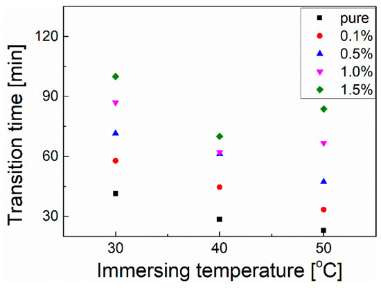 The transition time vs. the immersing temperature for the membranes immersed in the solution.