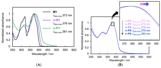 (A) UV-vis absorption spectra of M1, m-D1, and the soluble part of m-P1 in CHCl3 (1.0 × 10–5 M for M1 and m-D1, and 0.84 × 10–5 M for m-P1); (B) UV-vis absorption spectra of m-P2–P6 in CHCl3.