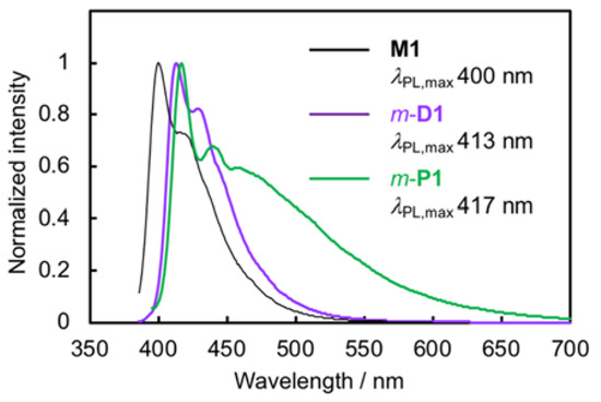 PL spectra of M1, m-D1, and the soluble part of m-P1 in CHCl3 (1.0 × 10–5 M for M1 and m-D1, and 0.84 × 10–5 M for m-P1), excited at each abs,max.