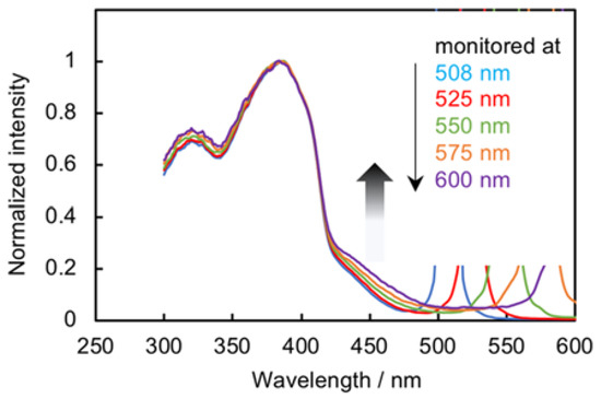 Excitation spectra of the soluble part of m-P1 in CHCl3 (0.84 × 10–5 M) at room temperature, monitored at 508, 525, 550, 575, and 600 nm. Intensities were normalized at peak tops around 380 nm.