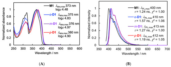 (A) UV-vis absorption spectra of M1, o-D1, m-D1, and p-D1 in CHCl3 (1.0 × 10–5 M); (B) PL spectra of M1, o-D1, m-D1, and p-D1 in CHCl3 (1.0 × 10–5 M), excited at each abs,max.