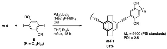 As shown in Scheme 2, the target polymer was synthesized via Sonogashira-Hagihara coupling using the same catalytic system as that of the synthesis of m-3. The reaction of m-4 with diiodobenzene derivative 5 afforded the corresponding π-stacked polymer m-P1 in 81% isolated yield. Once the polymer was precipitated, all of the polymer solid was not dissolved in solvents. The structure of the CHCl3-soluble part (84.2 wt/v %) of m-P1 was confirmed by the 1H and 13C NMR spectra that were recorded in its CDCl3 solution. The number average molecular weight (Mn) and polydispersity index (PDI) of the soluble part of m-P1 in CHCl3 were estimated via gel permeation chromatography (GPC) to be 9400 and 2.5, respectively, using polystyrene (PSt) standards. A thin film was obtained from the CHCl3 solution by the casting or spin-coating method. The polymer showed thermal stability; 5 wt % weight loss was observed at 298 °C by TGA analysis (Figure S11, Supplementary Materials). As shown in Figure S12 (Supplementary Materials), in the DSC analysis, glass transition temperature (Tg) and crystallization temperature (Tc) were observed at around 60 and 170 °C by the first scan, respectively, whereas no peaks appeared in the second scan. Thus, the polymer showed sufficient thermal stability.
