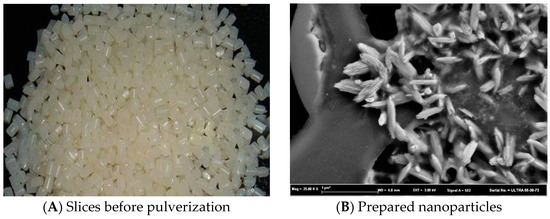 Figure 1A is a photo of copolyester slices and Figure 1B is a scanning electron micrograph of copolyester particles, showing that the prepared particles were uniform in size and exhibited an irregular rod-like or granular structure. It is speculated that the shape of the particles is related to the stirring speed of the copolymer (up to 3000 rpm) during the precipitation process. The fine aqueous-phase emulsion droplet environment is also an important factor in the formation of ultrafine particles.
