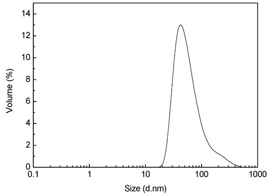 Figure 2 reveals the copolyester particle sizes and their distribution in the copolyester. Most of the polyester particles were found to have a particle size between 20 and 100 nm, and a small portion had a size of 100–800 nm. This shows that the particles obtained by this method can reach the nanometer scale with a uniform particle size distribution and can disperse well in an aqueous phase. This is in good agreement with Figure 1.
