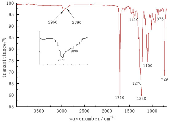 Figure 3 is an infrared spectrum of the PBTI hot melt copolyester. The sample showed a strong carbonyl stretching vibration peak at 1710 cm−1, a stretching vibration peak of CH2 at 2960 cm−1, a skeleton vibration peak of the benzene ring at 1410 cm−1, and stretching vibration peak of typical ester CO bond at 1240 cm−1 and 1270 cm−1. A symmetric stretching vibration peak—a peak of 1270 cm−1—indicates a characteristic peak of CO from a benzoic ester group, and an absorption peak of 1240 cm−1 is a characteristic peak of the CO connecting a benzoester group. At 1100 cm−1, we detected a C–O stretching vibration absorption peak of the ester group. The two peaks at 876 cm−1 and 1020 cm−1 correspond to the vibration absorption and the out-of-plane deformation vibration absorption of the phenyl–H in the phenyl group, respectively. At 729 cm−1, the rocking vibration of butanediol methylene was evident. The presence of methylene, p-phenyl, m-phenyl, and ester groups could be clearly detected from the infrared spectrum.