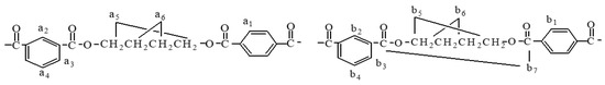 Figure 4 shows hydrogen and carbon atoms at different positions on the copolyester chain. The labels a1, a2, a3, a3, a4, a5, and a6 are protons at different structural positions; b1, b2, b3, b3, b4, b5, b6, and b7 are carbon atoms at different structural positions.