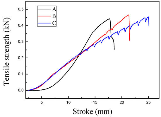 Tensile curves of polyester/cotton fabrics (A: 0 g/L, B: 0.25 g/L, C: 0.5 g/L).