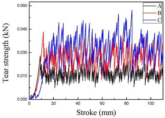 Tear curves of polyester/cotton fabrics (A: 0 g/L, B: 0.25 g/L, C: 0.5 g/L).