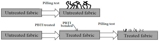 As discussed before, the anti-pilling performance of polyester/cotton woven fabrics was improved by padding ultrafine copolyester particles followed by heating. For the untreated fabric, after the pilling test, the inner fiber bundle was drawn out, and some fibers twined together, leading to an unpleasant pilling appearance. However, after PBTI was applied and heated, the fabrics could be bonded by PBTI, and, after the pilling test, fewer and thinner fibers were drawn out because of the blocking effect of PBTI. Figure 11 demonstrates the mechanism of this anti-pilling strategy by hot adhesion.