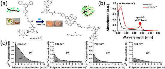(a) Schematic of self-assembly through metal–terpyridine ligand interaction, (b) UV-vis spectrum of P30 when adding metal ion Fe2+, and (c) sol-gel transition graph of P30, depending on different metal ions (Fe2+, Ni2+, Zn2+, and Co2+) applied in different polymer concentration solutions (1–10 wt %).