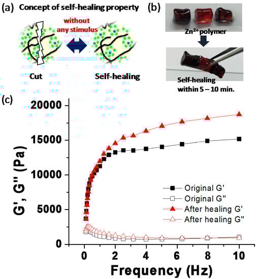 (a) Concept of self-healing property with norbornene-based polymer, (b) illustration of the self-healing property of the Zn-complex gel, at room temperature, without an external stimulus, and (c) storage (G’) and loss (G”) moduli of Zn-complex gel and self-healing gels.