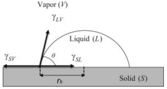 where γsv, γsl and γlv represent the “surface tensions” of the interface solid/gas, solid/liquid and liquid/gas, respectively, and θ represents the contact angle.