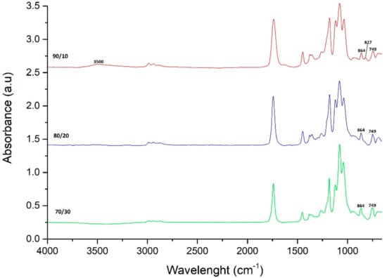 For the second set of experiments, it was necessary to keep the monomer ratio constant. The FTIR spectrums of the copolymers with different monomer ratios were analyzed (Figure 3). The spectra of the 90/10 (l-lactide/PPGDGE wt %) copolymer presents some unreacted PPGDGE because the symmetric and asymmetric stretches of the epoxide ring are present (907, 839, 756 cm−1) and the broad band of the O–H stretching of the hydroxyl groups at 3500 cm−1 can be seen. With 80/20 and 70/30 these bands completely disappear due to a complete reaction of the epoxy groups present in the PPGDGE. In appearance, the 70/30 (l-lactide/PPGDGE) copolymer was rubberier than the 80/20, because of the inclusion of more PPDGE chains into the copolymer. Based on this evidence, the monomer ratio chosen to carry on the second set of experiments was the 80/20 (l-lactide/PPGDGE).