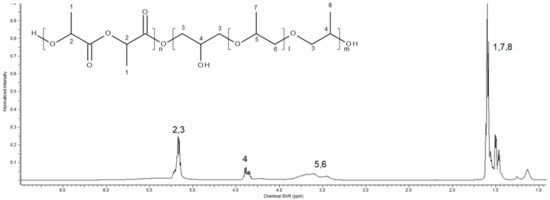 The 1H NMR spectrum was taken in deuterated chloroform. It shows the typical signals of PLA and furthermore the PPGDGE signals (Figure 4). Signals at 5.1 ppm were assigned to methane protons (–CH) from the PLA block, the signals at 4.3 ppm belongs to methane protons of the carbon that is attached to the OH group that is formed when the epoxide ring is opened, the signals at 3.5 belonged to methylene protons (–CH2) from PPGDGE and, finally, the methyl protons (–CH3) from PPGDGE and PLA block were at 1.6–1.4 ppm.