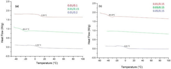 As observed, in Figure 5, at the thermogram (a) the amount of initiator (1-dodecanol) used to carry out the reaction was modified, it is observed that with concentrations around 0.15 wt % the formation of more chains of PPGDGE than PLA is being favored since the Tg is around −39.2 °C. In the thermogram (b) the amount of Sn(Oct)2 used was varied and it is found that when a greater amount of catalyst is added, the Tg can reach −3.61 °C, indicating in this case that raising the amount of Sn(Oct)2 would favor the formation of more PLA chains within the copolymer.